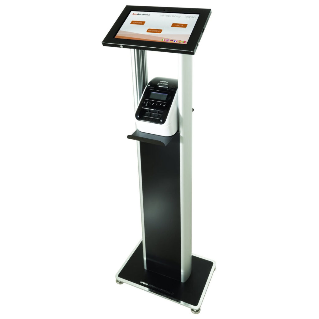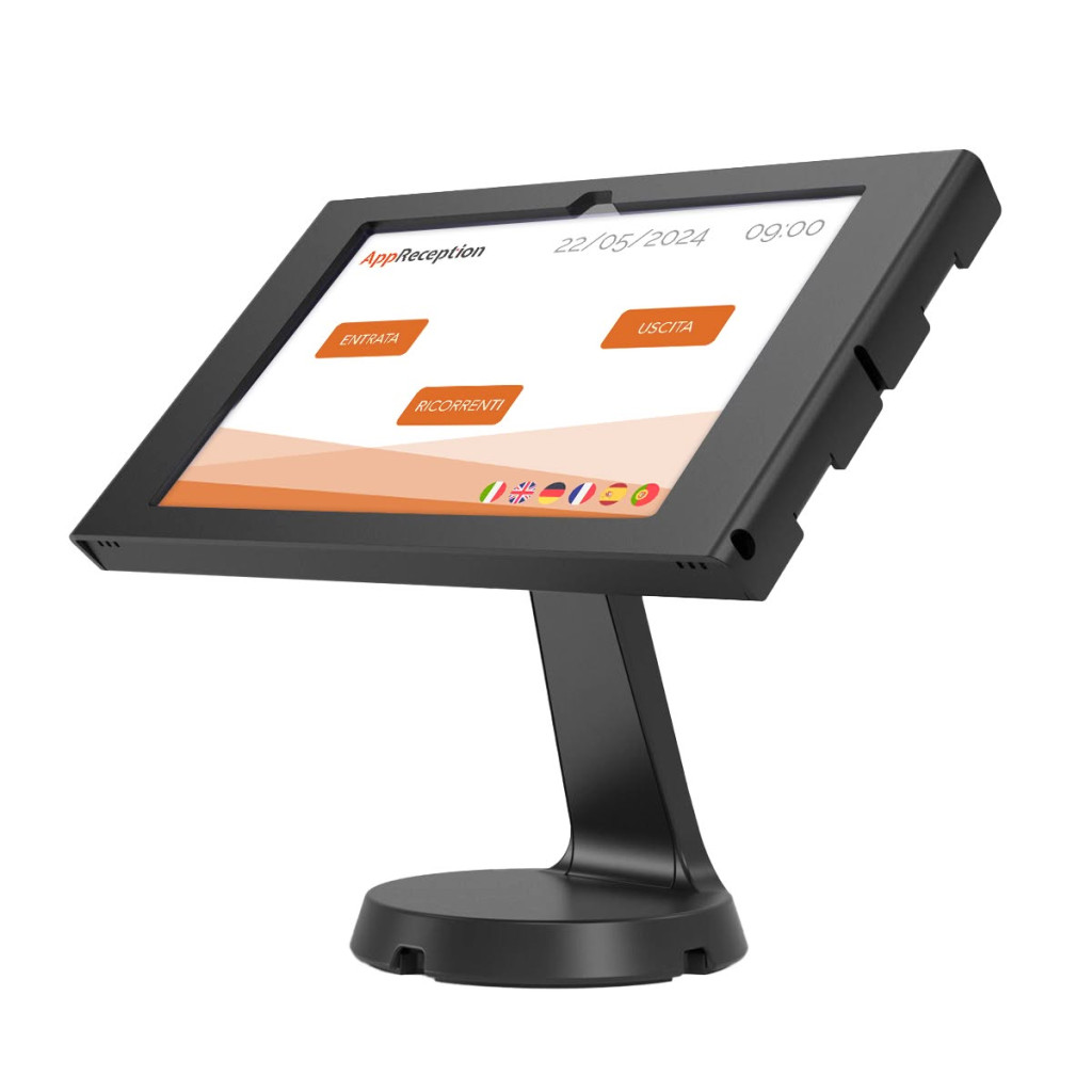 Soluzione completa composta da una postazione da pavimento con schermo da 11 pollici, dotata di WiFi, Bluetooth e fotocamera frontale. Il dispositivo viene fornito con AppReception preinstallata in modalità chiosco e una tastiera semplificata personalizzata.